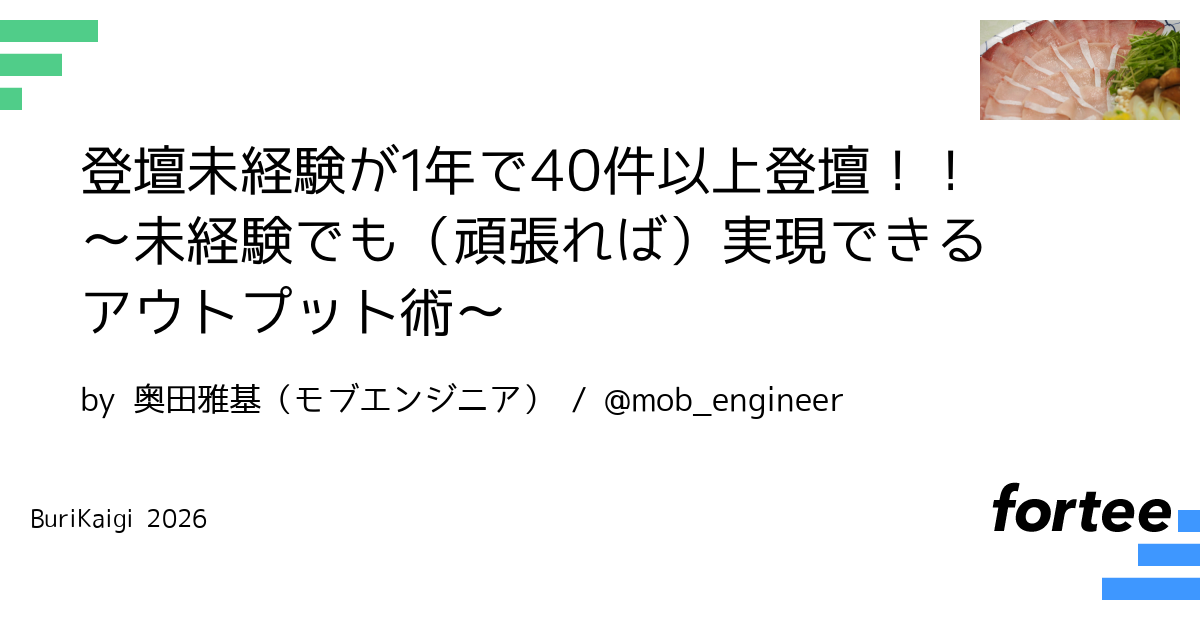 タイトルを見て「本当ですか?」と思われるかもしれません。事実、2024年まで登壇活動はおろか社外コミュニティへの参加はほとんど行っておりませんでした。そんな経歴の私ですが、2025年(10月時点)では社外登壇数40件超を達成しています。今回のセッションでは「未経験でも(頑張れば)私と同じペースでアウトプットできる方法」について紹介したいと思います。