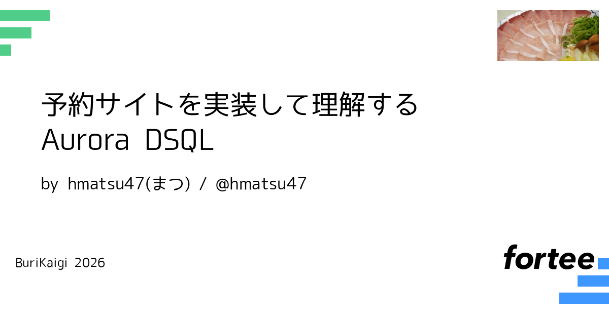 私自身は、これまで「ゲームで体感!Aurora DSQL の OCC」(JAWS ミート 2025)や「攻略!Aurora DSQL の OCC」(JAWS FESTA 2025 in 金沢)などのセッションを通じて、Aurora DSQL のキモである OCC(楽観的同時実行制御)の特性を紹介・説明してきましたが、参加者の反応などから、やはり具体的なアプリケーションの実装例が示されないと理解が難しい印象を受けました。