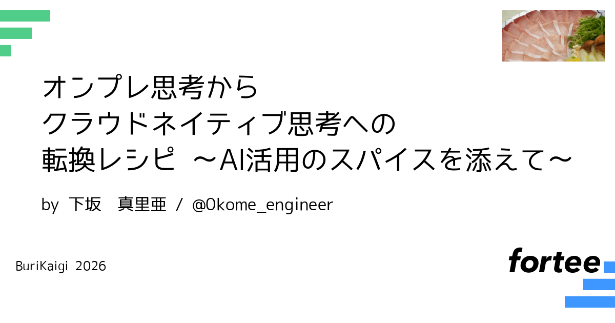 オンプレミス脳からクラウドネイティブ脳への「思考のリファクタリング」を、料理のレシピのように4つのステップで話します。現場の失敗談と成功体験を材料として混ぜ込み、クラウド移行の悩みを解消するレシピを提供します。