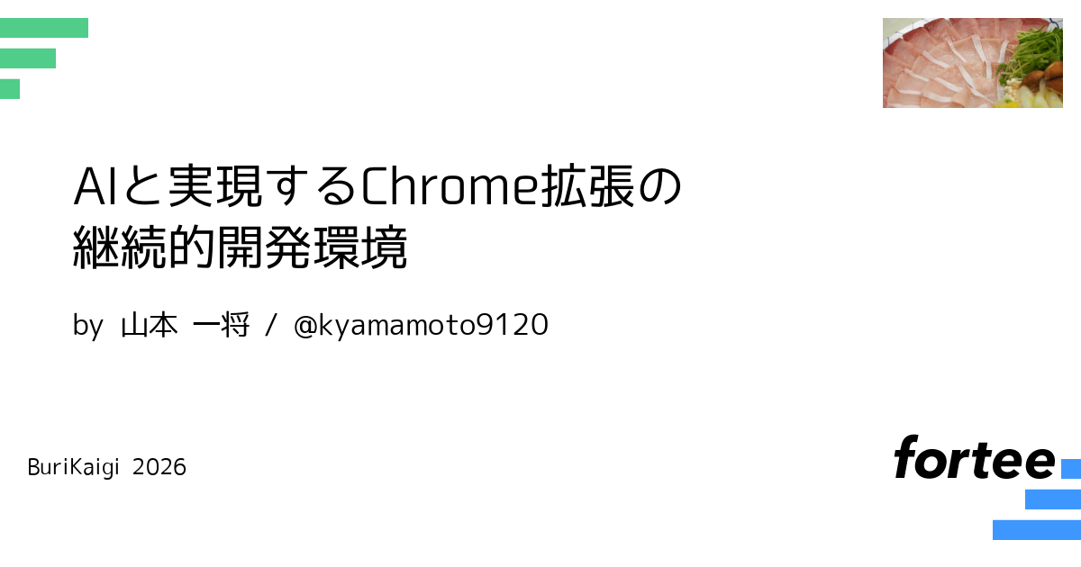 本セッションでは、私が個人開発している Chrome 拡張の実際の開発環境を題材に、Chrome 拡張の E2E テスト自動化の方法やデプロイの自動化といった継続的開発を行うための開発手法を紹介します。