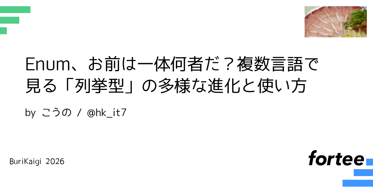 一見シンプルなEnumですが、その実装は言語の哲学そのものです。本セッションでは、この共通概念が各言語でどのように進化し、開発者にどのような設計上の恩恵と制約をもたらしているのかを、実用的なコード例を交えて比較・考察します。