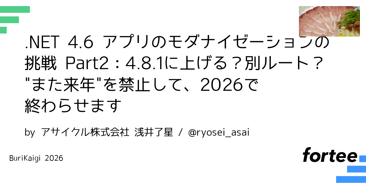 昨年(2025)は、.NET 4.6.2 を .NET 4.8.1 に移行して延命するのか、あるいは別の道(段階移行やモダナイズ)を取るのか―「どこへ向かうべきか。課題は何か。」をディスカッションしました。