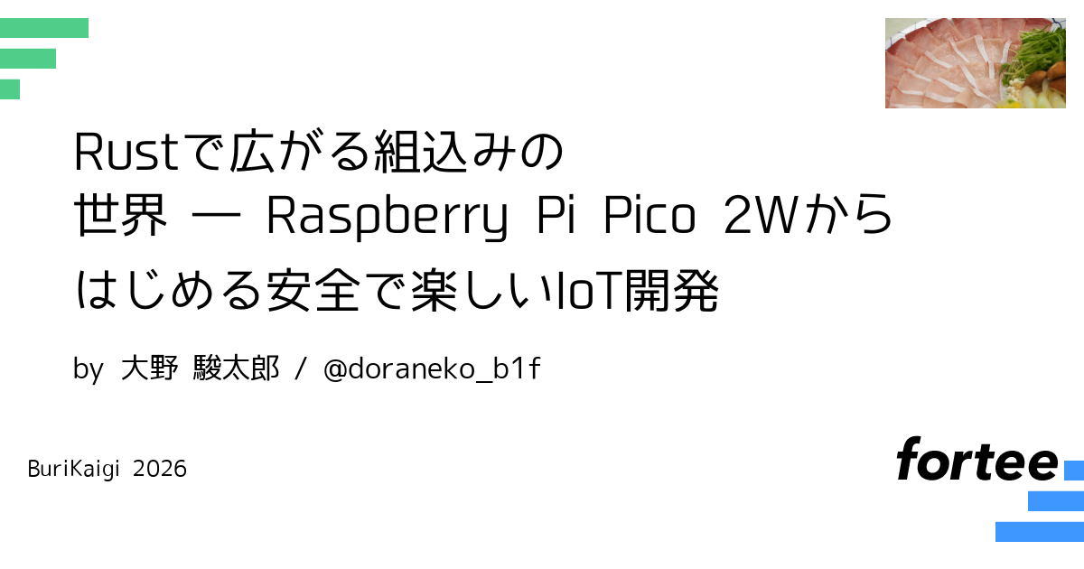 このトークでは、そんなRustの「安全さ」と「気軽さ」を両立させる実践方法を、Raspberry Pi Pico 2Wという分かりやすい題材を通して紹介します。コードの細かい部分よりも、「なぜこう書くと安全なのか」「どんな考え方で設計するとRustが生きるのか」というポイントを中心にお話しします。また、途中でPico 2W特有の“ちょっと変わった構造”(PIOによる柔軟なI/O制御や、無線モジュールCYW43の動作など)にも軽く触れ、マイコンの内部構造を理解する面白さも感じてもらえるようにします。