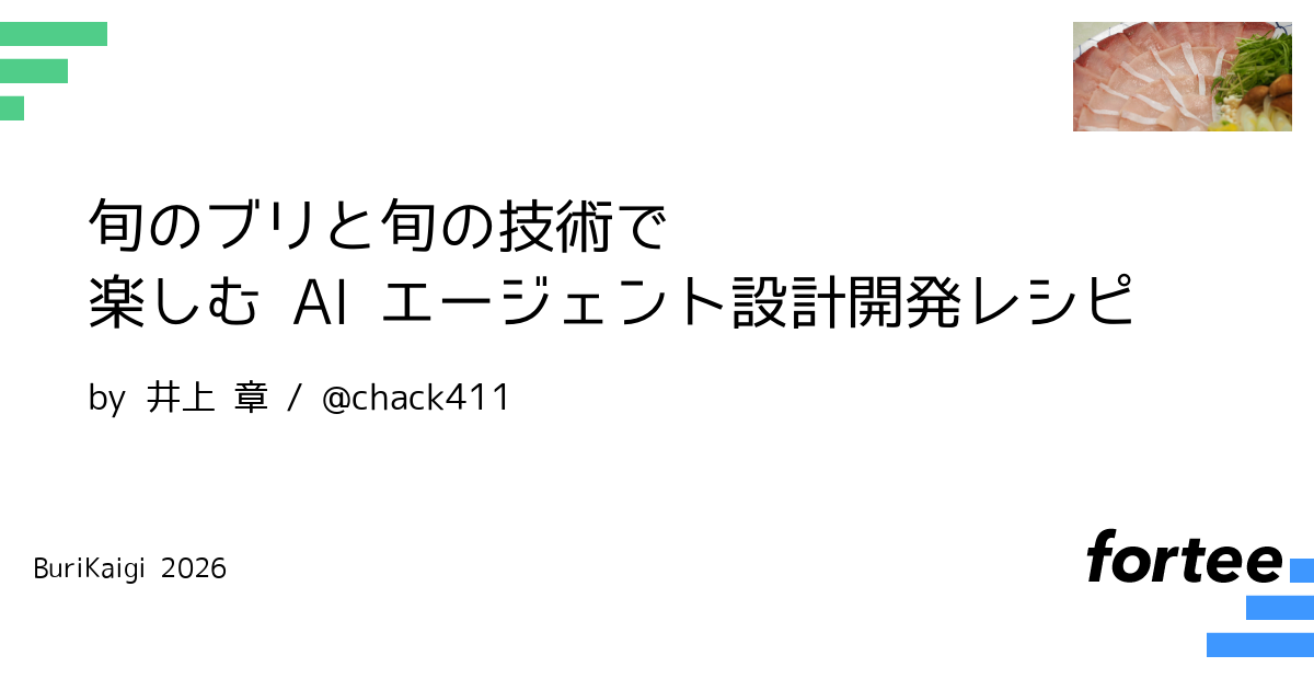 BuriKaigi ならではの「技術の旬」を楽しく理解できるセッションです。前菜は、業務を分解して繋ぐためのマルチエージェントオーケストレーションパターン。メインディッシュには、最新の Microsoft Agent Framework と Azure AI Foundry を中心に、 .NET 10 と Visual Studio 2026 / VS Code の新機能を添えます。デモを通じて、旬の技術を味わいながら AI エージェント設計開発の本質を楽しみましょう!