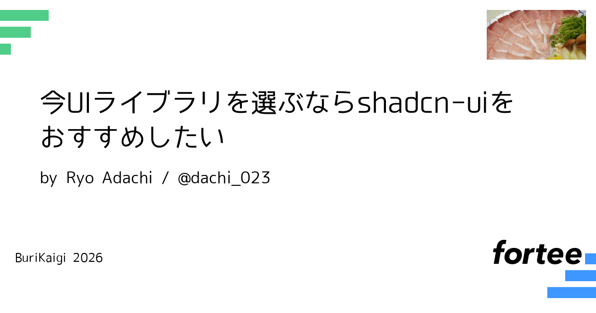UIライブラリは入れ替わりが早い一方で導入後はコンポーネント構造やテーマ設計・CSSトークン・A11y実装などがライブラリ側で固定化されやすく、結果としてロックインが生じやすいです。 本セッションではその前提を踏まえつつ、いま shadcn-ui をどのように評価し、ロックイン等のリスクと向き合うべきなのかを考えます。