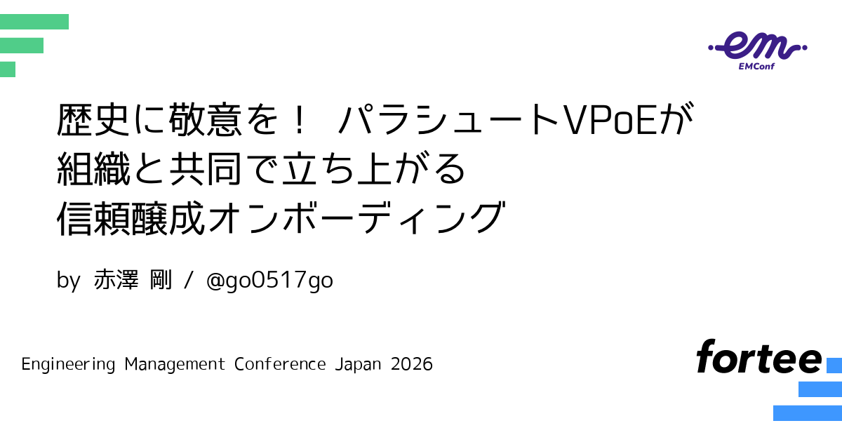 こうした実践から、新任者の最初の期間をすぐ成果を出す期間ではなく、見えていない背景を共有し、中長期で活躍するための組織診断力を備える期間として位置づけました。本セッションでは、パラシュート的に参画するVPoEやEMが組織と協働で立ち上がるためのオンボーディング設計を紹介します。
