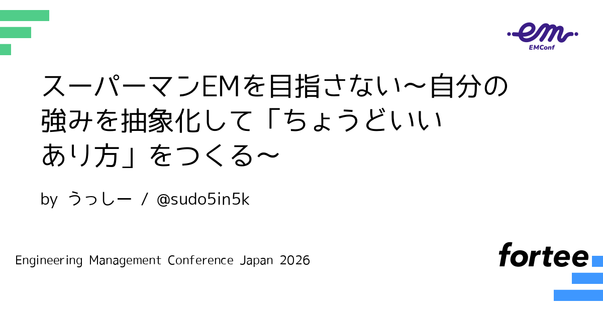 このセッションが小さな対話と変化を生み出す触媒となり、「自分にはこういう強みがあり、このあり方でいればいい」と納得して次の一歩を選べるきっかけになればと思います。キャリアに悩むEMにほんの少しでも勇気を持ち帰っていただけるような、等身大の視点でお話しします。