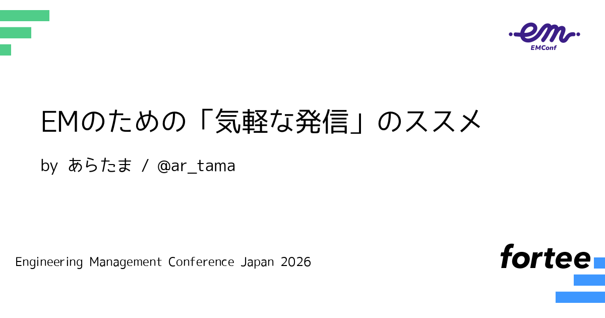 というわけで、このトークでは、事業とエンジニアリングのマネジメントについて探求を重ねるひとりのEMが、社内の発信活動(日々のコミュニケーション・ドキュメンテーション、プレゼン)と社外の発信活動(ブログや登壇から、書籍の執筆に至るまで)をどのように相互に影響させ合ってきたかを、実例をたっぷり交えながらお話しします。皆さんにとっての踏み出しやすい「発信の最初の一歩」を見つける機会となれば幸いです。