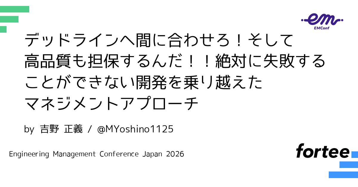 本セッションでは立場の強いステークホルダー、調整余地のないリリース日があり、急造の開発チームにて膨大かつ不確定な要求という困難な状況下でのプロジェクトを乗り越えたエピソードをベースにお話しします。
