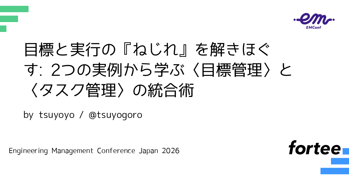 組織の成長に伴い、チームメンバーが (時にはEM自身も...!!)「なんのためにこのタスクをやっているのか?」という目的を見失いがちになる問題は、Engineering Managerにとって避けて通れない課題です。OKRのような目標管理フレームワークがあっても、目標を考えるマネジメント側と、それを実行するメンバー側の間に"ねじれ"が生じ、結果として目標は未達に終わるケースが多々あります。私 (発表者) 自身、この課題に両側から向き合い、目標管理とタスク管理をシームレスに連携させる実践的なアプローチを模索してきました。