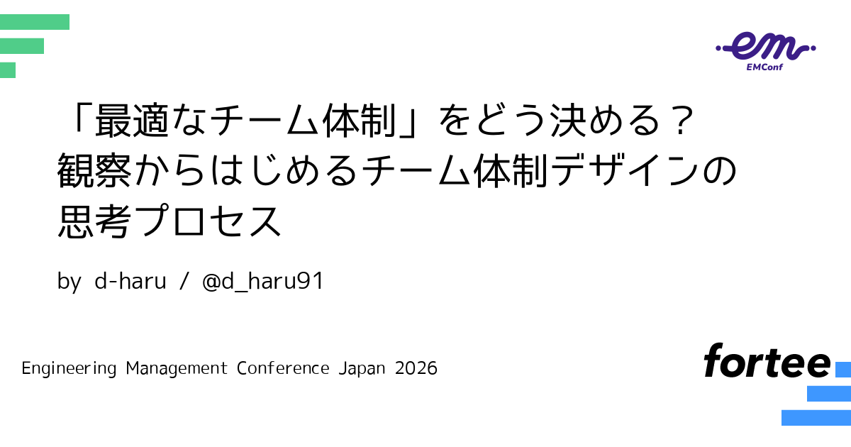 事業環境の変化やチームの停滞感に応じて開発体制を見直す必要があります。本セッションでは、7〜8名規模のチームを例に、現状観察から体制検討、提案、実施、ふりかえりまでの一連のプロセスを事例とともに紹介します。参加者は自分自身のチームの課題にフィットした体制改善のアプローチを具体的に考えられるようになります。