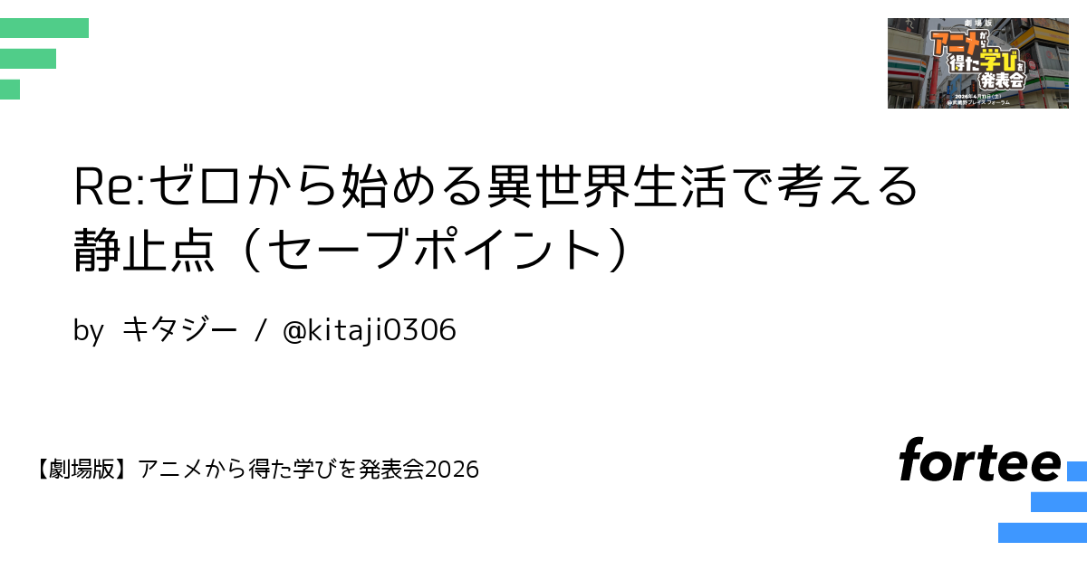 本LTでは、『Re:ゼロから始める異世界生活』の「死に戻り」をヒントに、システム運用における『静止点(セーブポイント)』の考え方を紹介します。