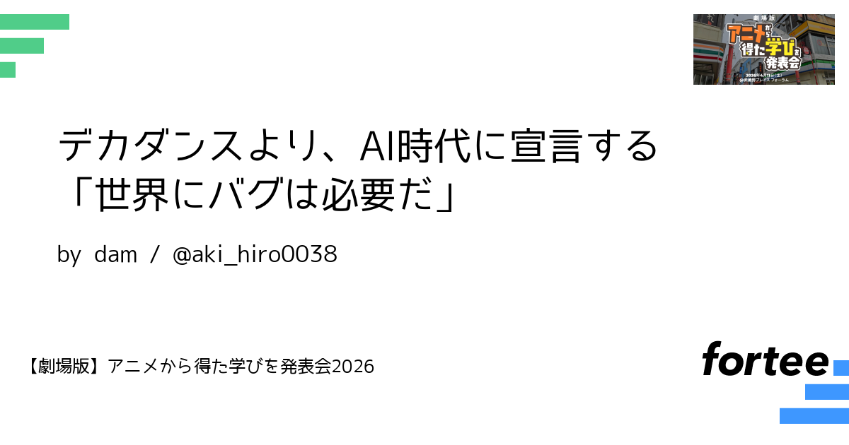 このLTでは、デカダンスの世界観を手がかりに、AIと共生する時代における「人間のバグ的価値」について考えます。