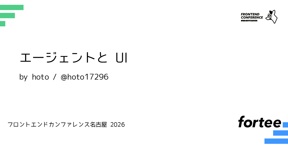 エージェントの振る舞いそのものは各種エージェントフレームワークや MCP などを活用することで比較的簡単に実現することが出来ます。しかしアプリケーション UI のことを考えると難易度が一段上がります。このセッションでは、エージェントの振る舞いと UI を連携させる際にどのような観点があるのかについて述べます。また、エージェントと UI を繋ぐプロトコルである AG-UI を紹介し、どのように実装することが出来るのかについて述べます。