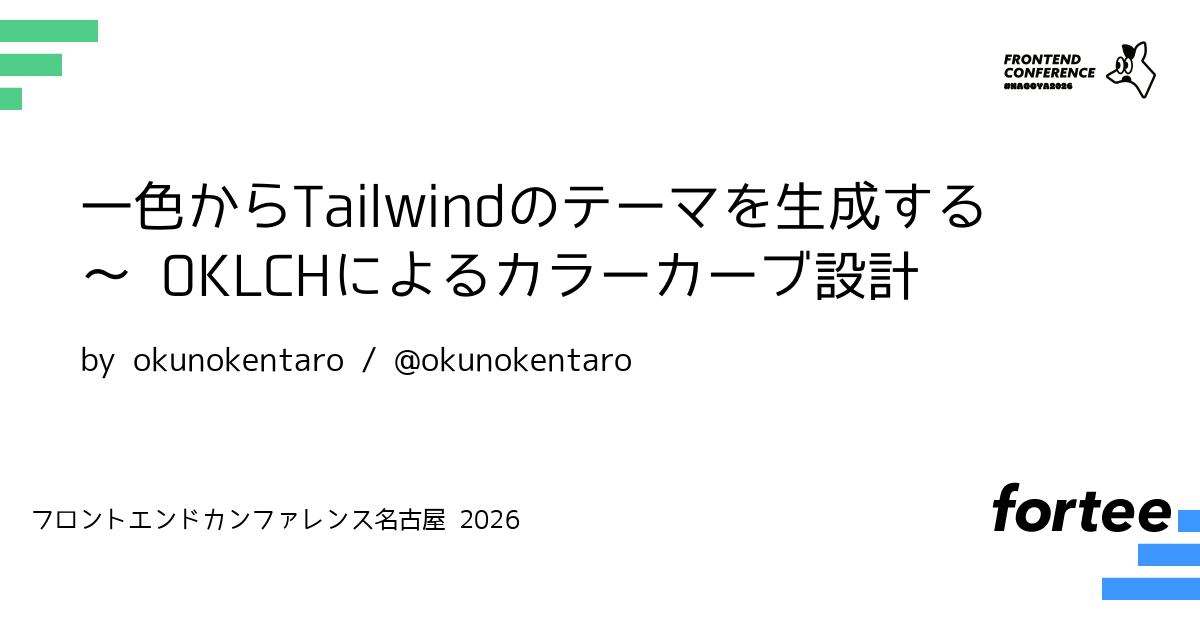 この課題に対してTailwindの全既存色を対象に、色相レンジごとにモデル化し、テスト駆動で検証することで、その変化を支えるカラーカーブを自動生成する関数を実装しました。この設計を成立させるためには、RGB や HSL では不十分で、知覚的に連続した補間が可能な OKLCH を用いることが不可欠でした。本セッションではそのモデリングや実装の過程を紹介します。