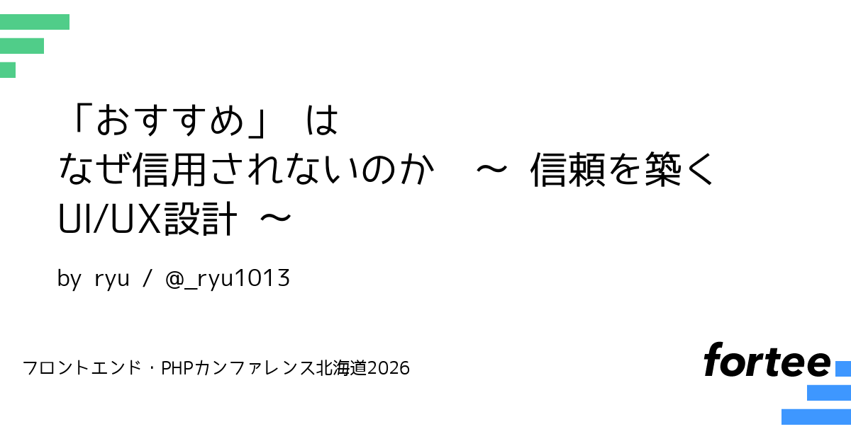 具体的には、UI/UX設計における「透明性」と「制御権」の2つの観点を深掘りします。メインの題材として、「レコメンドシステム」を取り上げ、有名アプリの事例を引き合いに出しながら、内部ロジックをフロントエンドがいかに「納得感のある体験」として翻訳・実装できるか、具体的なUIパターンを交えて解説します。