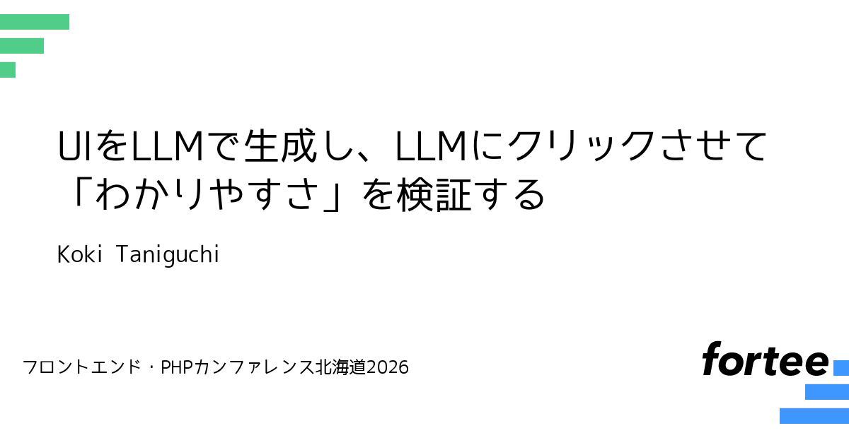 本トークでは、ASCIIワイヤーフレーム等の画面表現+クリック要素/遷移を構造化し、スキーマ/整合性を機械検証した上で、別LLMに「最初の1クリック(First-click)」を選択式で回答させて定量評価する手法を紹介します。