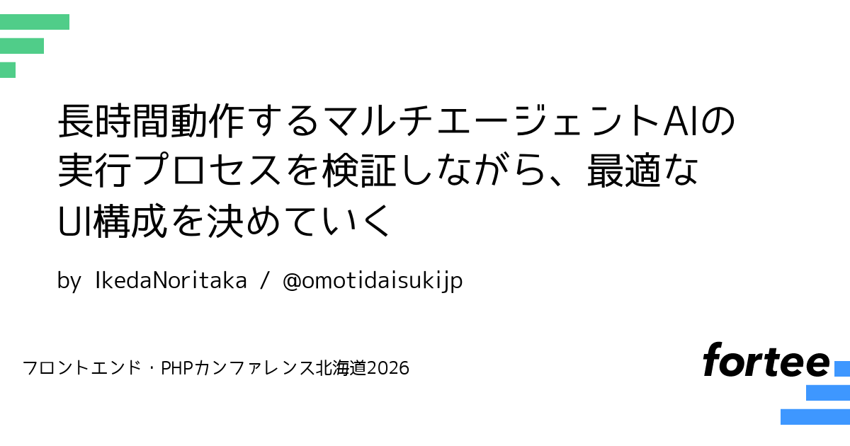 本セッションでは、ストリーミング表示、中間成果物の即時確認、バックグラウンド実行と通知、エージェント単位の進行状況可視化といったパターンを紹介するとともに、それらの中からどの手法をどのような判断軸で選択し、実際のプロダクトへ適用してきたのかを解説します。パターンを銀の弾丸とせず、実装と検証を通じて設計判断を積み重ねてきた実践知を共有します。
