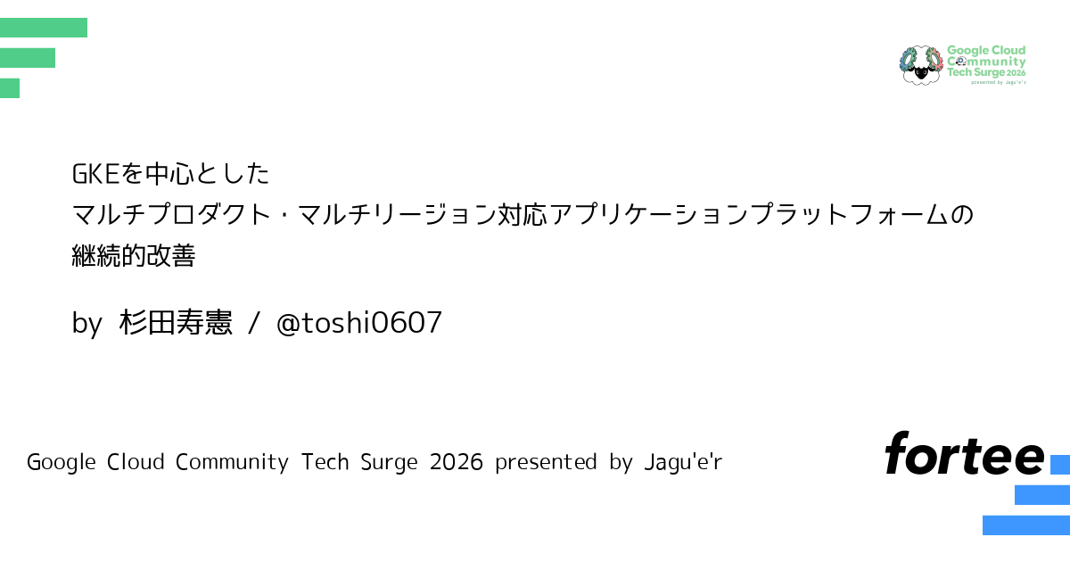 株式会社LegalOn Technologiesでは、事業の急拡大に伴い、50以上のマイクロサービスを含むシステムを「単一リージョン・単一プロダクト」から「マルチリージョン・マルチプロダクト」構成へ移行する大規模なリアーキテクチャを敢行しました。 本セッションでは、開発者の認知負荷を最小限に抑えながらこの複雑な要件を満たすために構築したアプリケーションプラットフォームの全貌を解説します。Google Kubernetes Engine (GKE) や Cloud Service Mesh を活用した基盤設計、Terraformモジュールと独自ツールによるクラウドやKuberentesリソースの抽象化、Google Cloudとシームレスに連携するOSSを活用したCI/CDの拡張、そしてSecurity Command Centerを用いたガバナンスまで、Google Cloudの機能をフル活用したプラットフォームエンジニアリングの実践知を、技術的な意思決定の背景と共に共有します。