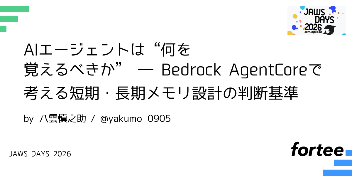 本セッションでは AgentCore の Memory 機能を題材に、短期・長期メモリをどのように分離し、どこに配置すべきかを設計視点で整理します。S3、マネージドメモリ、外部データストアといった選択肢を比較し、それぞれのメリット・デメリットや、実際に試して分かった失敗しやすいポイントを紹介します。