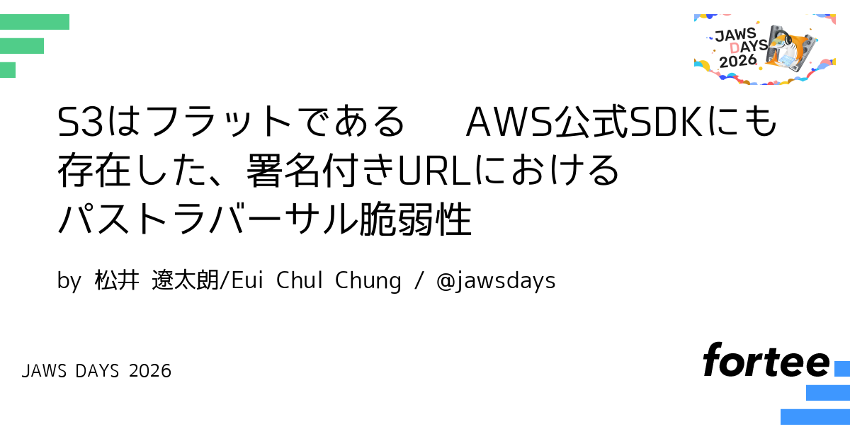 署名付きURLはモダンなアプリケーションで多く使用されていますが、実装次第ではパストラバーサルの脆弱性を生むことをご存知でしょうか? S3は本来ファイルシステムのような階層構造を持たないフラットな構造ですが、バケット名やオブジェクトキーに../のように相対パスとして解釈される文字列が含まれる場合に、SDK開発者やOSS開発者によってパスが誤って「正規化」されてしまうと、意図しないリソースへのアクセスを許してしまいます。