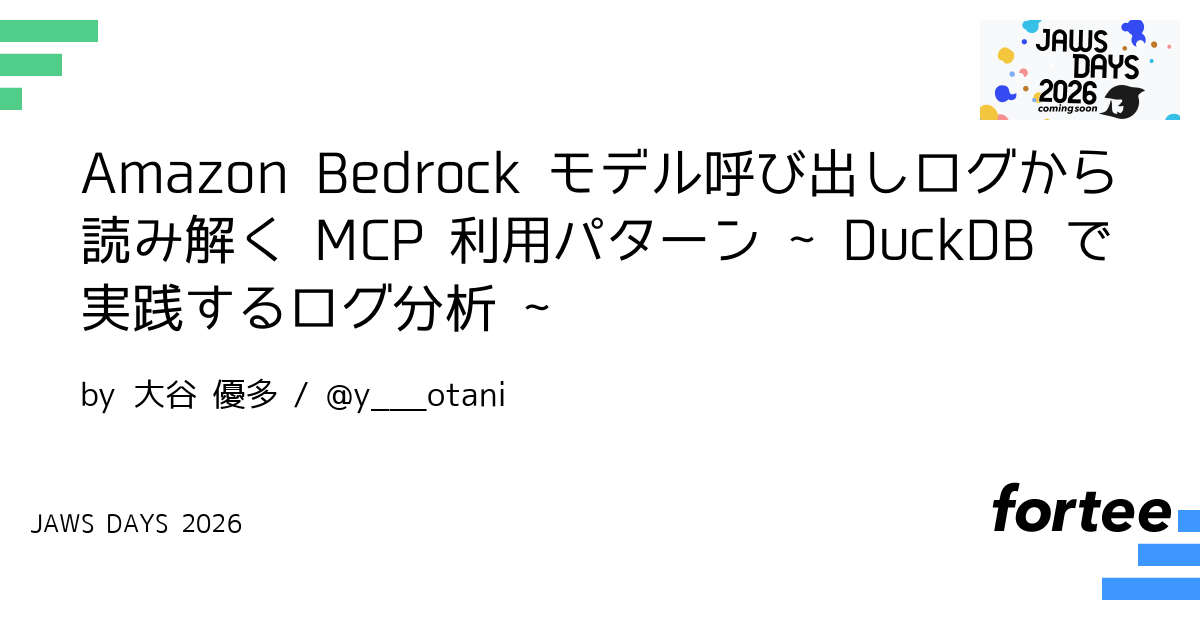 組織で AI 活用が進む中、「どの MCP ツールが実際に使われているか」といった利用実態に関する情報は、AI 活用の方針を決定するための材料となります。Amazon Bedrock のモデル呼び出しログにそれらの情報が記録されており、本格的な分析基盤を構築せずとも、DuckDB なら環境構築不要で手元ですぐ分析できます。
