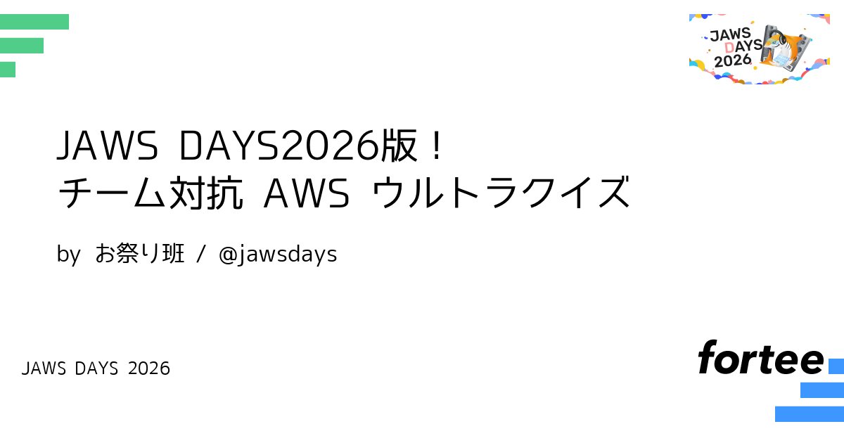 大人気企画「チーム対抗ウルトラクイズ」がまたまたやってまいりました!伝説のAWS芸人や AWS のスペシャリストたちがお助けメンバーとして参加してセッションを盛り上げて頂きます。 優勝チームにはオリジナル景品あり! こちらは個別の事前申し込みが必要です。お一人で申込いただき、こちらでチームを組みますので安心して参加いただけます。皆さんの参加をお待ちしています!