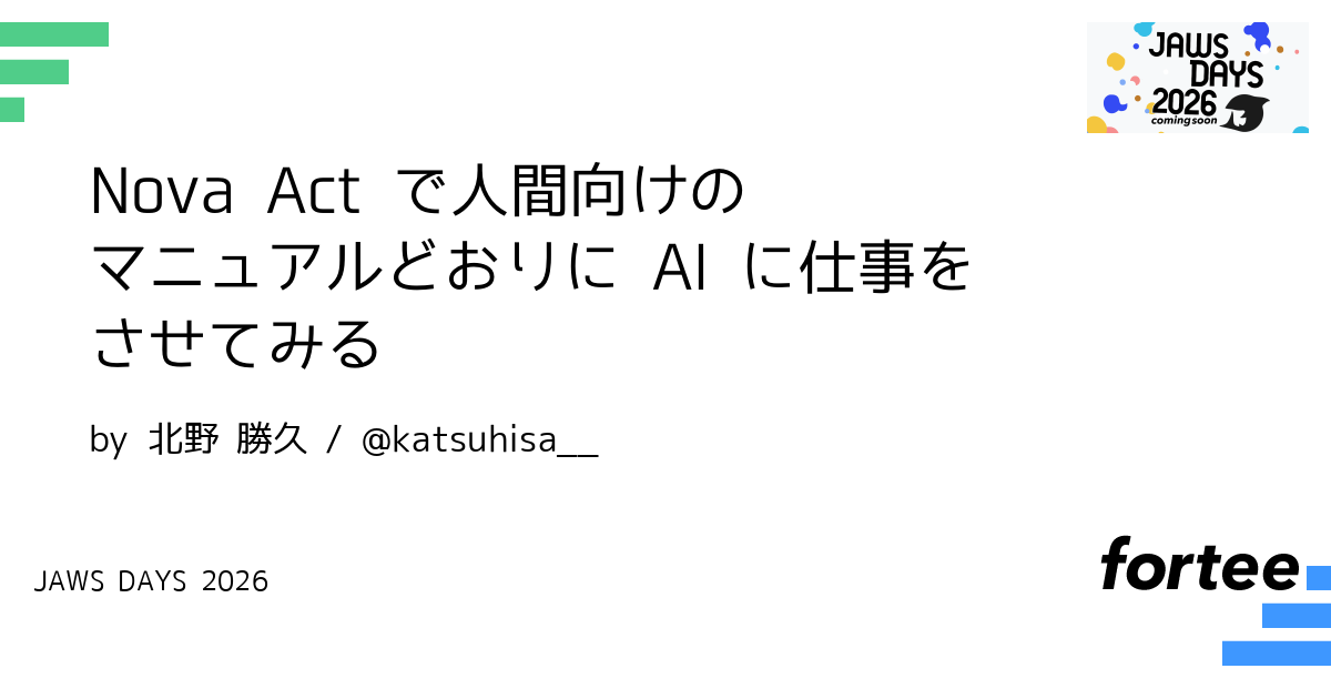本セッションでは、前半に「Nova Act とはなにか」「どう利用を開始し、一体、何が便利なのか」を紹介した後、後半では人間向けのマニュアルどおりに仕事ができるのかを実演し、現時点での課題、乗り越えるべきポイントや Tips を解説します。