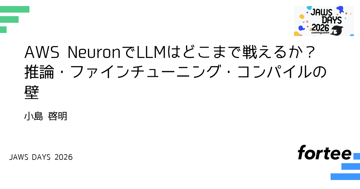 本セッションでは、コスト効率に優れたこのチップを使い倒すべく、徹底的な検証結果を共有します。 単なる推論だけでなく、モデルごとのコンパイルの境界線、ファインチューニングの実践、オブザーバビリティ確保など、泥臭い検証結果を共有。さらにre:Invent 2025の最新機能も速報的に検証します。