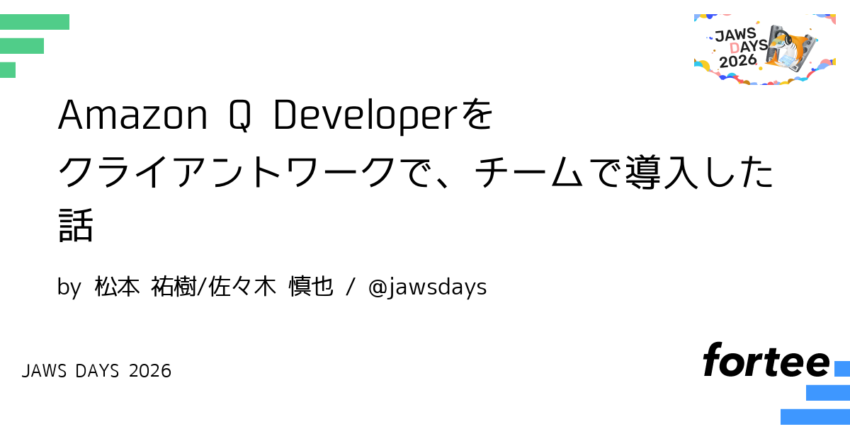 Amazon Q Developer(IDE版)をクライアントワークで導入してみました。 クライアントにAmazon Q Developerをご紹介してから、チームメンバーに触ってもらい、 チームの生産性が向上するまでの流れをお話したいと思います。 受託開発でAmazon Q Developerが利用されている事例をご紹介いたします。