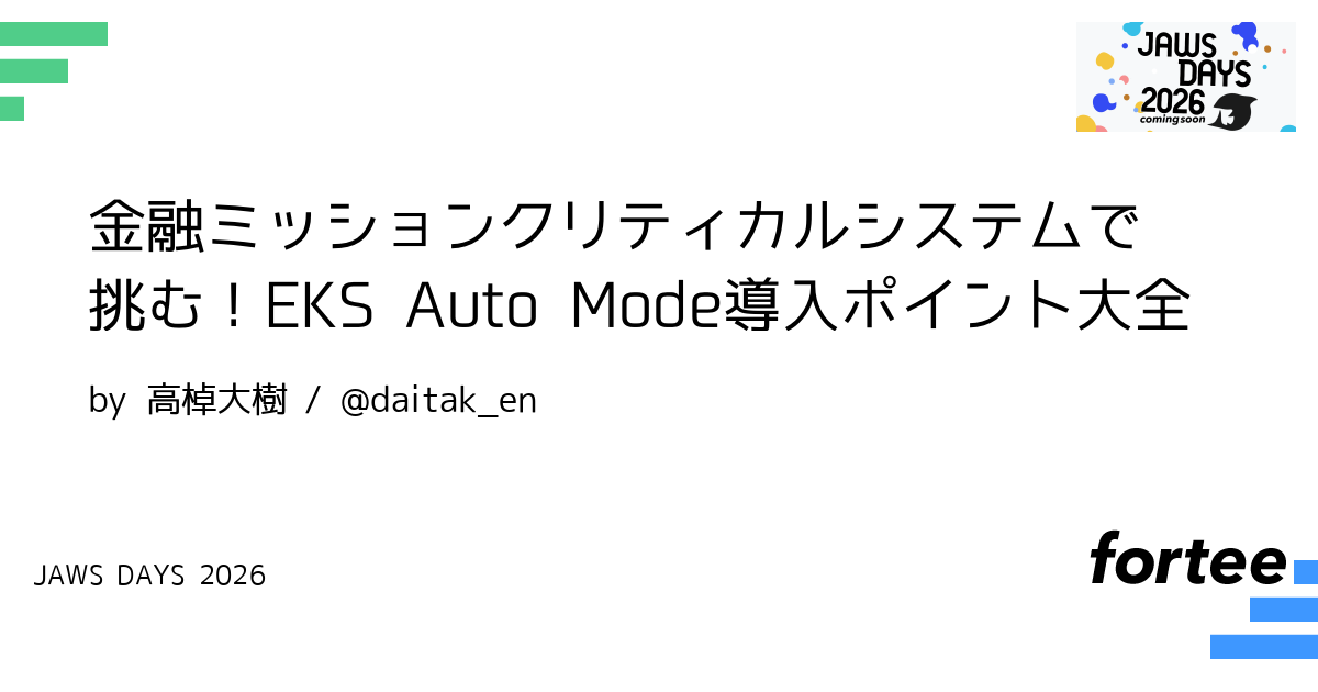 本セッションでは、24時間365日稼働、かつエラーが許されない金融ミッションクリティカルシステムでEKS Auto Modeをどの様に導入したのか、その裏側をリアルに公開します。