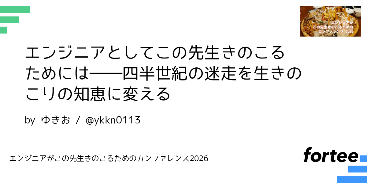 40代になってもこの先生きのこれるかという問いは続いています。しかし、これまでの失敗や迷走も、現在までエンジニアを続けているという事実の前では、すべて経験の一部となります。 まとめとして、時代の状況や自らの失敗に翻弄されながらも、エンジニアとしての誇りを胸に歩み続けてきた経験から、若手エンジニアに対し、自身のキャリアを長期的に捉え、生きのこるための視点を提示します。