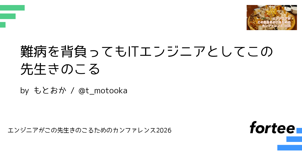 ITエンジニア職の多くはデスクワークであり、病気の内容にもよりますが、他の職業に比べれば闘病しながらのお仕事も容易です。とはいえ制約が全く無いかというとそうでもありません。このトークでは、そういった制約事項にこれまでどのように立ち向かってきたのか、そしてこの先どうしていくのかの予定、などについて紹介していきます。