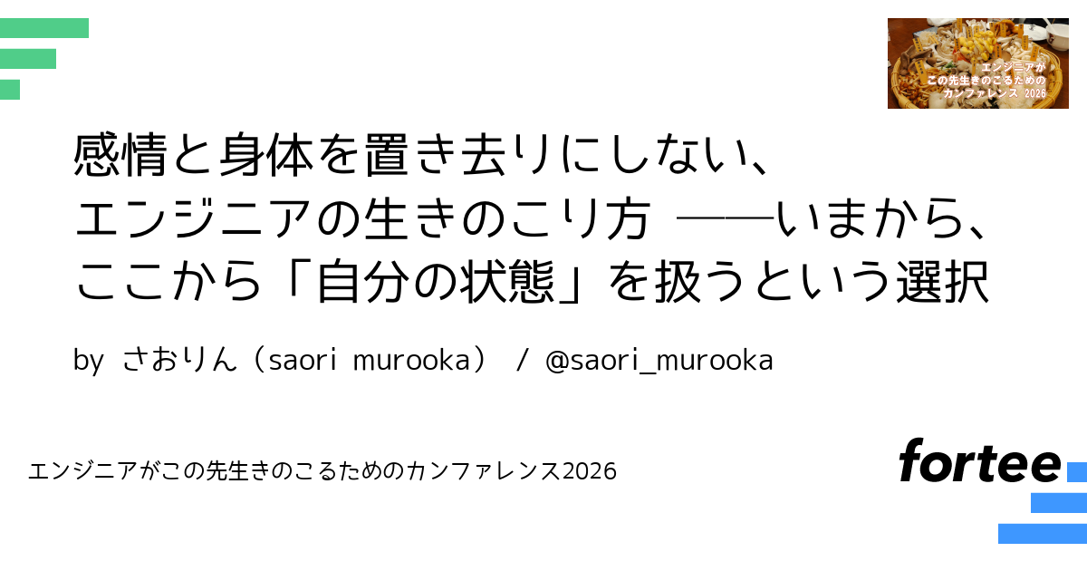 未来に向けて新しい技術を学ぶ前に、まず「いまの自分の状態」に目を向ける。本セッションでは、エンジニア自身が壊れずに働き続けるための、現場に根ざした視点を共有します。