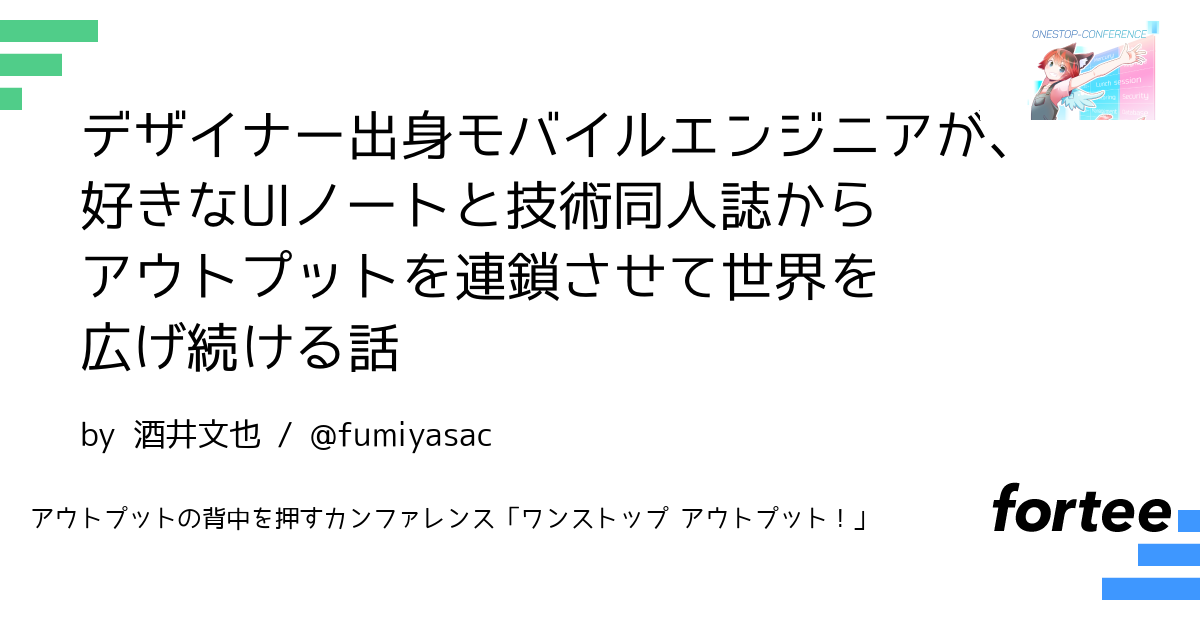 僕のアウトプットの原点は「UIの動きが好き」というただのオタク心でした。デザイナーからWeb、そしてモバイルエンジニアへと職種が変わる中で、気になったUIをノートに描き起こし、小さな実装サンプルを書き、Qiita・Zenn・技術同人誌へと育てていくうちに、登壇や商業誌執筆、技書博スタッフ活動まで世界が広がりました。このセッションでは、好きなことを出発点に「ノート → サンプルコード → 記事・本 → イベント運営」へとアウトプットを連鎖させてきたこれまでを、成功だけでなく失速した時期や燃え尽きかけた瞬間も含めて正直に振り返ります。最後に、特別な肩書きや実績がなくても、今日からできる“好きベースのアウトプット設計術”を具体的なステップとしてお持ち帰りいただきます。技術同人誌やカンファレンス登壇に興味はあるけれど一歩目が踏み出せない人の背中を、そっと押せる時間にできればと思います。
