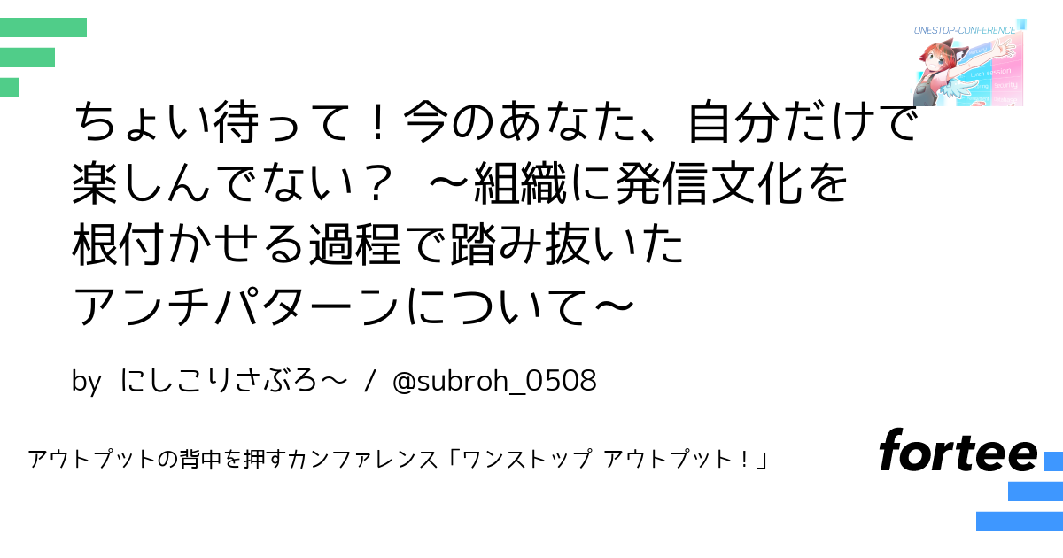 自分も、登壇を中心とした発信活動を通し、キャリアを切り拓いてきた自負を持っています。多くのリターンがある発信活動、それを社内にも広め、同じ組織の仲間に成長機会を得てもらいたい!と長らく試行錯誤を続けてきましたが、それは失敗の連続でした。自分のように「発信そのものを楽しめる人」は見落としがちですが、発信活動はしばし多くの労力を伴い、能動的な行動へとつなげるには、様々な壁を超えなければなりません。