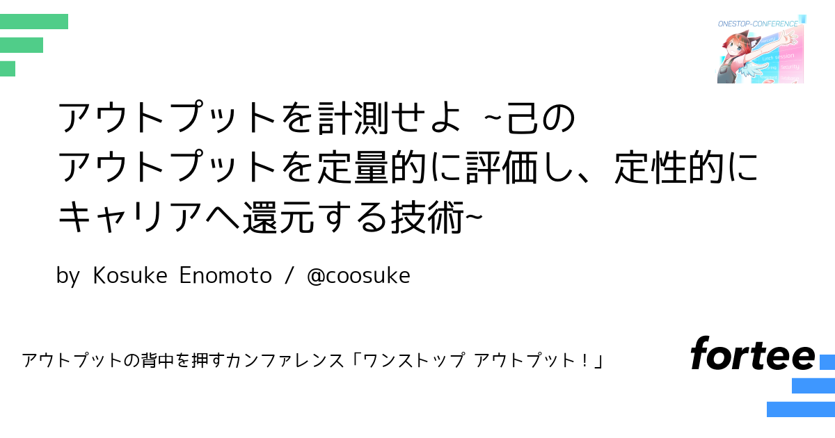 「アウトプットは怖い」「何から始めればいいかわからない」。その不安の正体は、行動に対する結果(アウトカム)が見えていないことにある、と私は考えています。本セッションでは、アウトプットを「運任せの発信」ではなく、自身のキャリアに還流させるための「実験と計測のプロセス」として捉え、アウトプットとアウトカムを計測することの重要性を話し、またこうした定量的なトレースを、自身の成長戦略にどう結びつけるか、私の経験談を含めてお話できれば、と考えております。