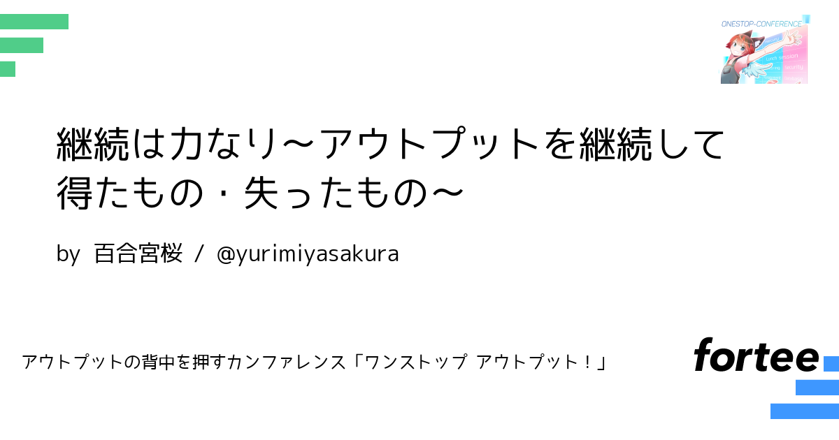 ただ、メリットとデメリット双方を認識してこそ、自身の行動を調整できるとも感じています。このライトニングトークでは、私が感じるアウトプットのメリット(魅力・得たもの)と失ったもの(デメリット)を正直にお話し、リアルな体験を届けることを目的としています。
