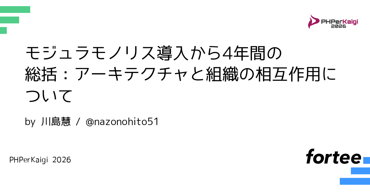 これらを振り返り、最終的に「モジュラモノリスアーキテクチャは技術だけでは駆動しない」などいくつかの私見に至ったため、それらを述べたいと考えています。疎結合なシステムや、コードの凝集度などの技術的指標だけでなく、組織の力学や人と人との関わりが、いかにシステムに反映されるかをお話ししようと思います。