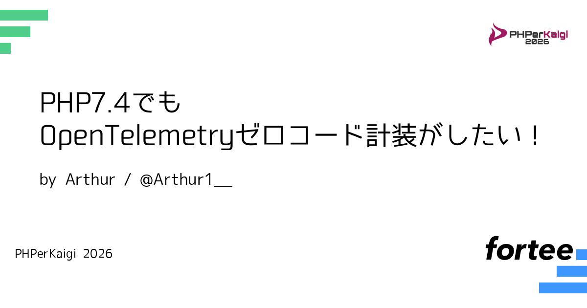 後半では、それでもPHP7.4でもトレースを労力少なくOpenTelemetryで計装したい!というニーズにお応えして2つの手法を提案し比較します。すでに公開されているOpenTelemetry eBPF Instrumentationを使った手法と、PHP8向けのOpenTelemetryゼロコード計装のインタフェースに倣って私が自作したextensionを用いる手法です。後者についてはその実現方法や、生成AIを活用したextension実装の進め方についても紹介します。