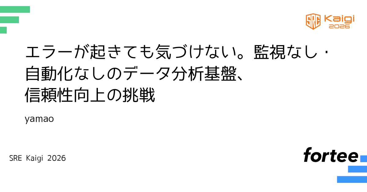 千株式会社では複数プロダクトの横断分析のためデータ分析基盤を構築していますが、「データの件数があわない」「データが取り込まれていない」という問い合わせからパイプラインの障害に気づくようなカオスな状態でした。そこから信頼性のあるデータ分析基盤を目指して、SREのプラクティスを取り入れながら発生していた課題について段階的に対応していったこととその歩みについてお話します。