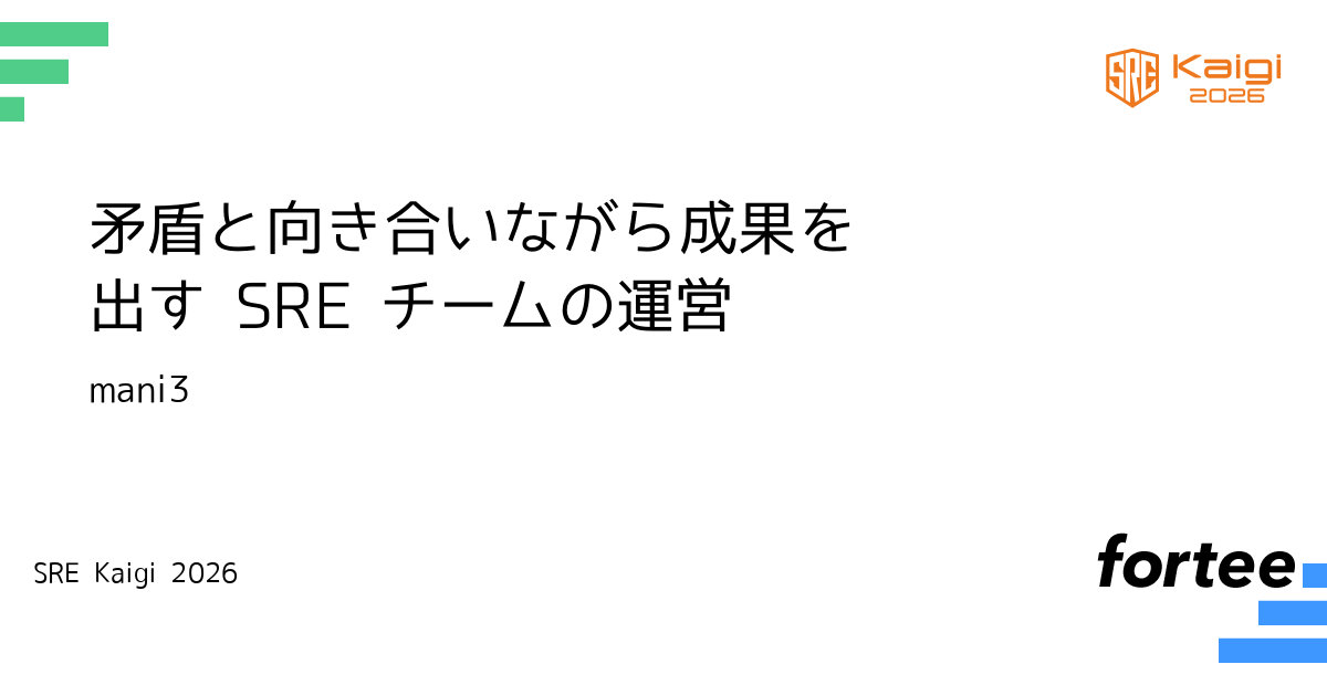 SRE チーム(リライアビリティ&セキュリティチーム)の組成から2年、エンジニアリングマネージャ(以下 EM)として人・チーム・技術の間の矛盾(成果で評価したいが測りにくい/スクラムで個のブレイクスルーが発生しにくい/横断課題を見つけたいがプロダクト理解が浅い)に直面しました。矛盾と共存しつつ、成果に結びつけるための SRE チームの運営の実践を共有します。