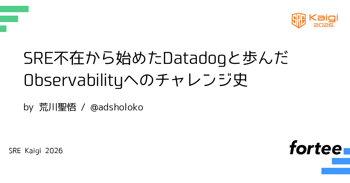 SREが不在だったからこそ、実績のあるツールを最大限活用するべくDatadogを採用するまでの変遷、そしてDatadogとともに2年間で取り組んだ全てのObservabilityに関する取り組みを、良い点も課題も包み隠さず、ご紹介したいと思います。本職SREの方々からすれば、拙い仕組みかもしれません。しかしながら、機能開発に集中しつつも、SREの取り組みをゼロから作り上げた進め方を紹介します。