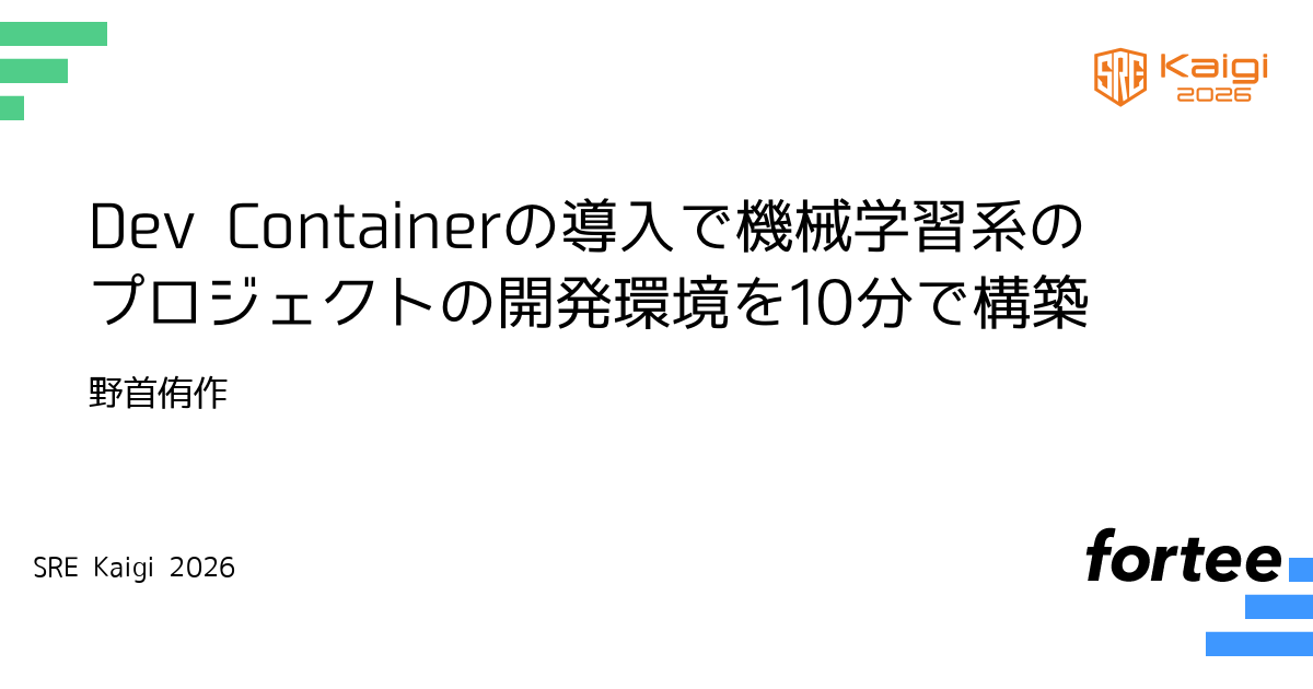 本発表では、開発環境の属人化や本番との差分といった課題に対し、Dev Containerによる標準化とCookiecutterでの横展開により解決する方法について説明する。