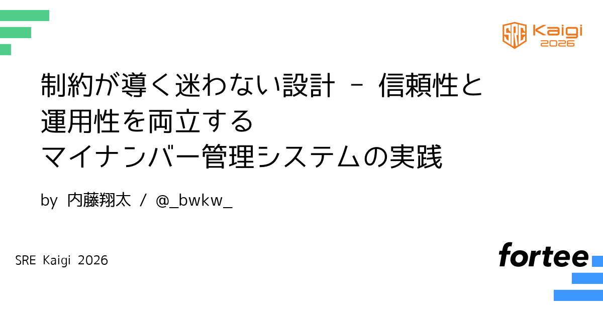 世の中的にセキュリティ規制や設計判断の難しさが増す中、「どこまで守れば十分なのか」「結論が出ずに進まない」といった意思決定の迷いは多くのエンジニアが抱える課題だと感じています。今回、約1ヶ月でマイナンバー管理システムの設計・実装を行うにあたって、個人情報保護委員会のガイドラインを設計判断の"制約"として捉えることで、データ分類に応じた暗号化方針、取扱範囲を限定するアクセス制御、組織単位でのリソース分離など、信頼性と運用性を重視した迅速でブレない設計判断を実現しました。本発表では、法的制約下での具体的な設計プロセスを紹介しながら、SRE の現場でも頻発する判断基準のブレ、場当たり的な設計、記録不在による手戻りにいかに対処してきたかを話し、現場に存在する制約を改めて正面から見つめ直すことが、設計品質と開発スピードの両立への鍵となるという気づきを共有します。自分たちでサービスの信頼性を担保したいエンジニアや、日々の設計判断・意思決定に悩んでいる方々に、持ち帰れるヒントがあれば幸いです。