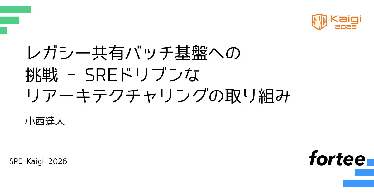 本セッションでは、このようなバッチ基盤にSREのプラクティスを適用し、信頼性の高いシステムへとリアーキテクチャリングした実践事例を紹介します。