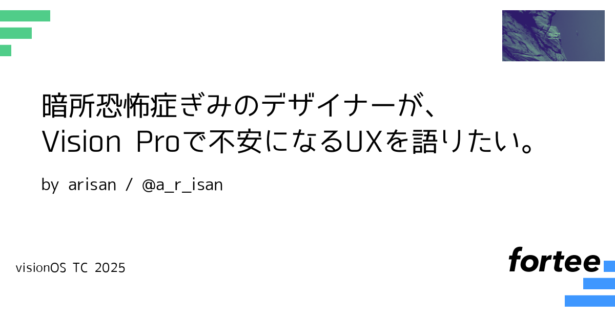 このトークでは暗所恐怖ぎみのデザイナーが、Vision Proで「ビビる瞬間」と、そのとき脳と体で起きてることを語ります。共感者求む。
