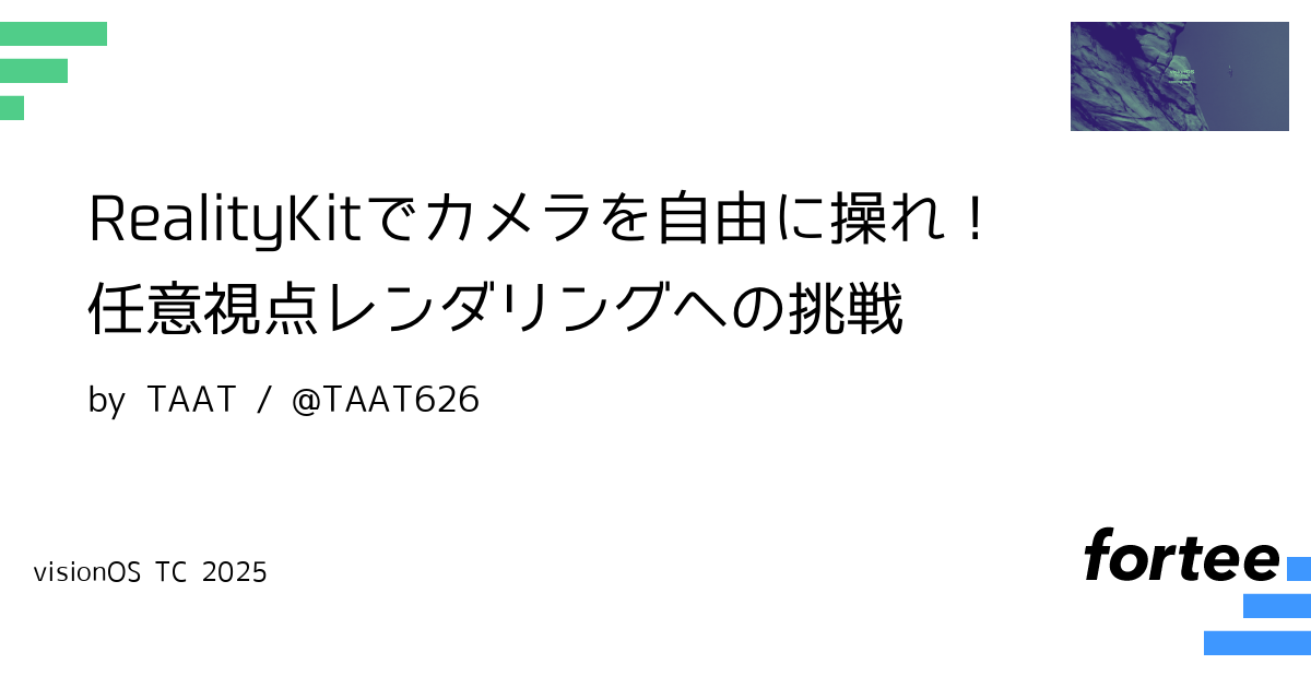 本トークでは、visionOSにおいてRealityKitで任意視点映像をレンダリングする方法と制約を実装例と共に紹介し、visionOSでのカメラ表現の幅を広げたい方に実践的なヒントをお届けします。