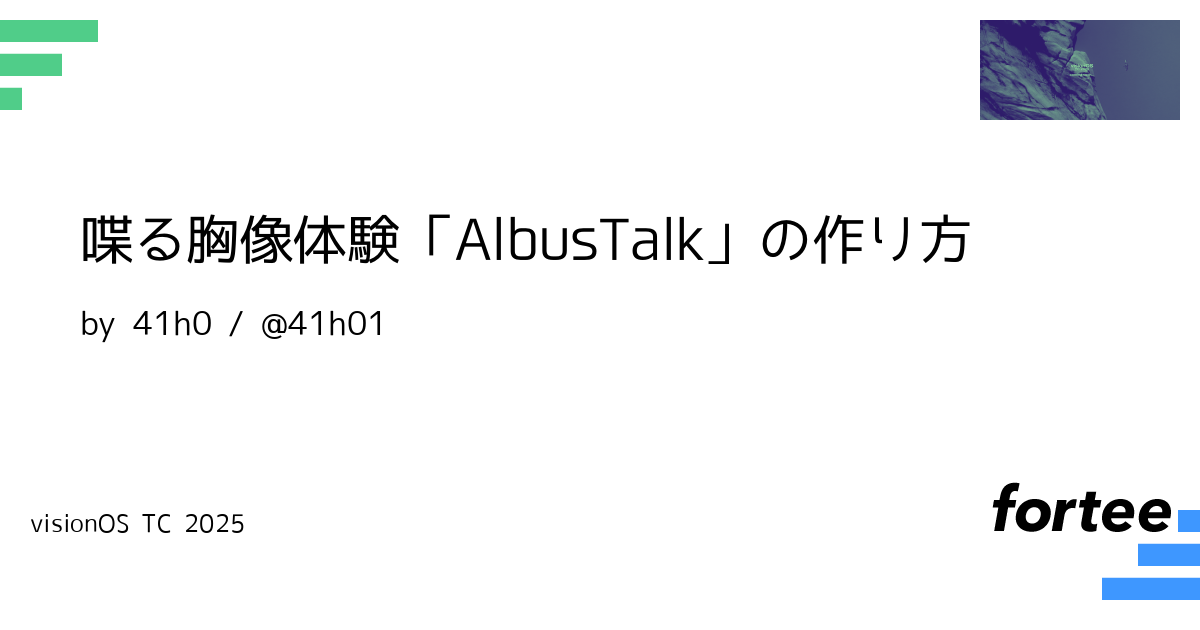 Apple Vision Proをかぶり、現実空間に置いた胸像の頭をなでると、胸像が目覚めて話しかけてくるMRアプリ「AlbusTalk」の技術解説を行います。 Unity/PolySpatial/Object Tracking/3Dプリントを組み合わせて実在の胸像が“動き出す”体験をどう実装したか、さらにOpenAI Realtime APIで自然な会話を実現する手法について解説します。