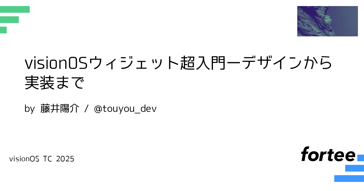 本セッションではvisionOSのために発表されたWidgetKitの新機能を用途・デザイン・実装方法の三つの観点で紹介し、いますぐvisionOS向けウィジェットの開発に取り掛かれる状態を目指します。